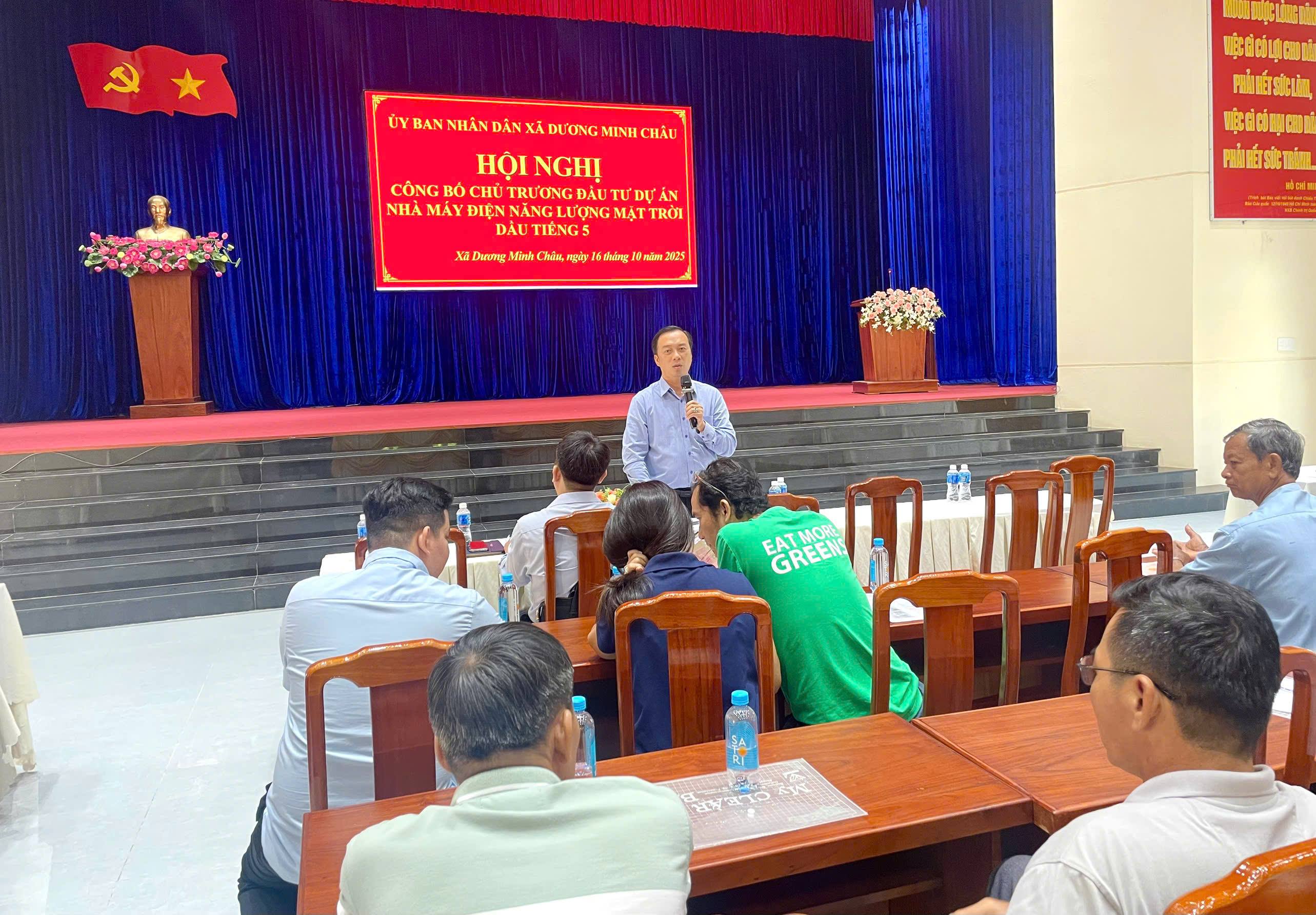 Sáng ngày 16.10.2025, UBND xã Dương Minh Châu tổ chức Hội nghị công bố chủ trương đầu tư Dự án Nhà máy điện mặt trời Dầu Tiếng 5. Tham dự hội nghị có ông Đinh Thế Trọng – Chủ tịch UBND xã Dương Minh...